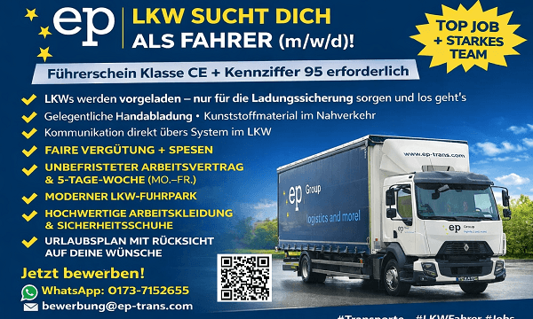 - Für die Position benötigen wir eine abgeschlossene Berufskraftfahrer-Ausbildung oder vergleichbare Güterverkehrserfahrung.